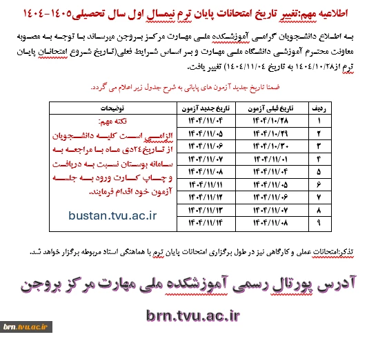 امتیاز دهید : تغییر تاریخ امتحانات پایان ترم نیمسال اول سال تحصیلی1405-1404 2 دوشنبه 22 دی 1404 ساعت 9:16